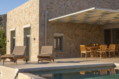 When you enter the villa's premises, you arrive at the garden area, with the pool and sea at your view. A few steps below you are at the main gate of the house. You enter through the open living room, dinner and kitchen area, the large windows offer an inside -outside feel while illuminating the room with natural sun light. The contemporary furniture add extra light with the white, and grey shades of fabric. Wood and stone are combined to give a natural feel.