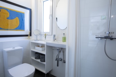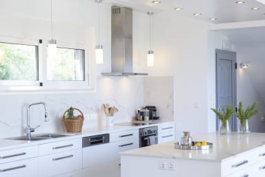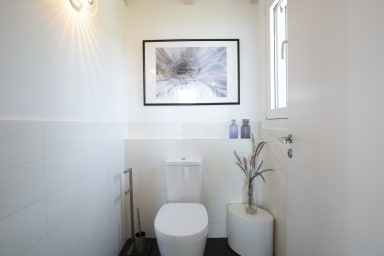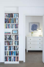 White gleaming kitchen with oven/dishwasher/fridge freezer combi, Nespresso machine, large kitchen island provides plenty of work surface for cooking aficionados, no top shelves. Big sliding door with direct access to morning terrace (you can watch the sailing boats go by while preparing dinner...).