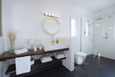 Villa Lefki is a very spacious villa perfect for people who need lots of breathing room. It is ideal for a family of four to six or two/three couples. The villa offers wide open spaces – a grand panorama window in the living room with incredible views of the sunrise, the sea and the sailing boats – a huge terrace with barbecue and outdoor shower – large pool (12 meters) – spacious bedrooms (2 with adjoining baths) – state of the art large kitchen – this Villa provides plenty of room for everyone – perfect for a relaxing and stress-free holiday. Air condition in each room. Access to the villa as well as the entire ground floor and terrace is wheel chair accessible (no stairs, extra wide entrance to bedroom and bathroom, wide open spaces in kitchen and living room).
