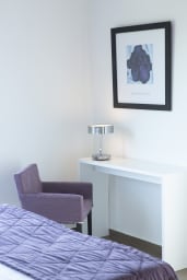 Bedroom/study combination (17 sqm) with twin beds (90X200), large desk, small library and direct access to secluded terrace. Separate bathroom with WC on the ground floor.