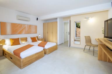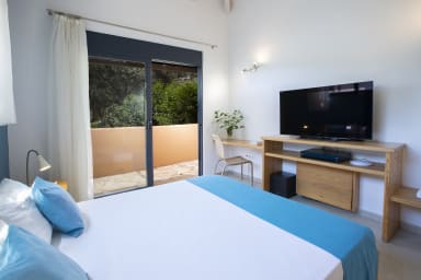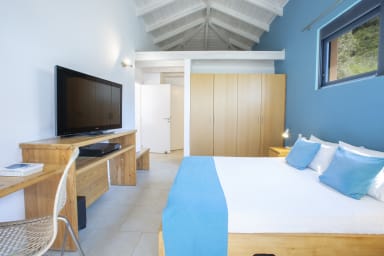 Une grande chambre avec 2 lits jumeaux (possibilité de les regrouper en un lit de 180 X 200), et coin bureau, une grande ouverture qui donne accès à une terrasse privative avec vue mer. De là vous pouvez rejoindre la piscine où la mer. Une salle de bain avec baignoire.