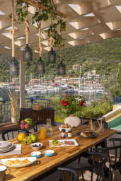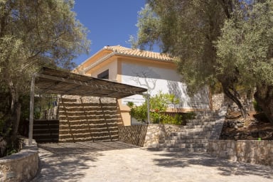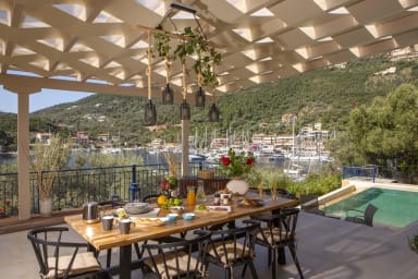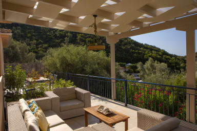Belle terrasse autour de la villa avec une vue splendide sur le port de Sivota: son vaste coin repas à l'ombre de sa pergola, son barbecue, un salon au sud particulièrement apprécié en fin de journée, un autre accolé à la maison (pièce fermée sur 2 cotés uniquement par des moustiquaires) où il fait bon se détendre autour d'un ouzo où d'un jus de fruits...