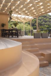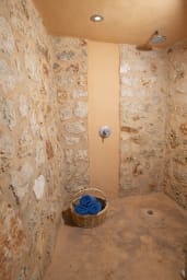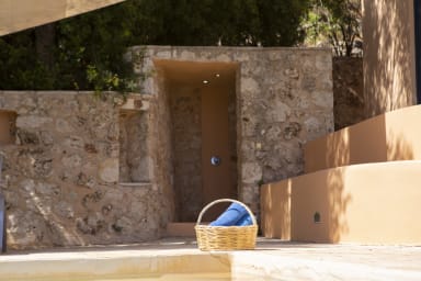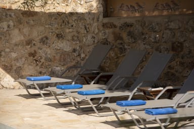 Encore quelques marches plus bas vous découvrirez une belle oliveraie avec hamac, table ombragée et banquette pour la sieste face à la mer. En traversant l’oliveraie, charmé par le chant des cigales, vous arriverez directement sur la petite plage.