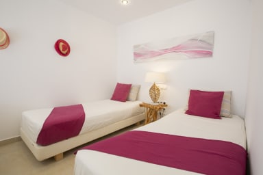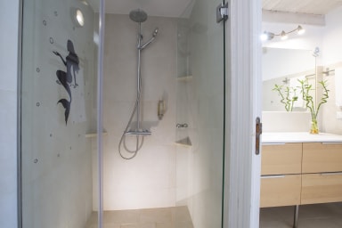 Une chambre avec 2 lits jumeaux pouvant se jumeler, salle de douche et wc. Porte vitrée donnant sur une petite terrasse et un passage permettant de rejoindre directement la piscine.
