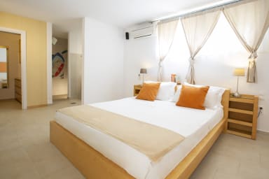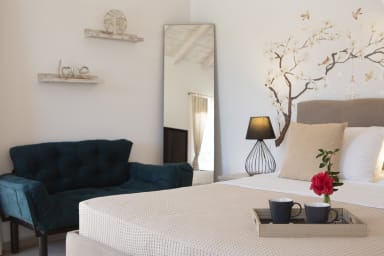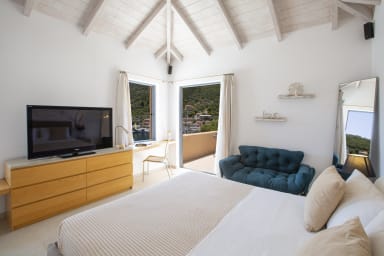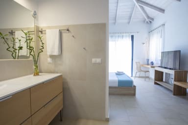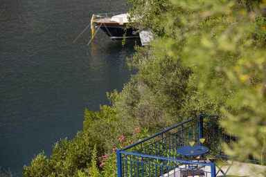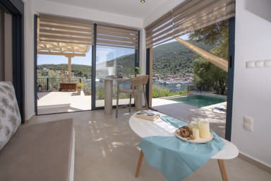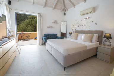 Une chambre avec lit queen size, salle de bain et wc ainsi qu' une superbe terrasse très privative dominant le port et la baie de Sivota.
