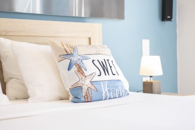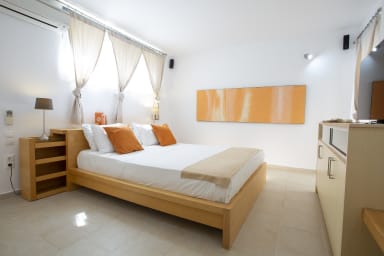 Une chambre avec lit queen size, salle de douche et wc, terrasse sud avec vue sur le port.