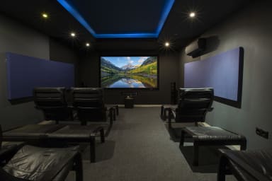 Une salle de cinéma avec écran de grande qualité de 99" un rétro projecteur full HD 5.1 sound system, lecteur blue ray , n'oubliez vos jeux et films.