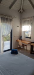 Una camera con letto King Size, bagno e wc e anche una splendida terrazza privata con vista sul porto e la baia di Sivota.